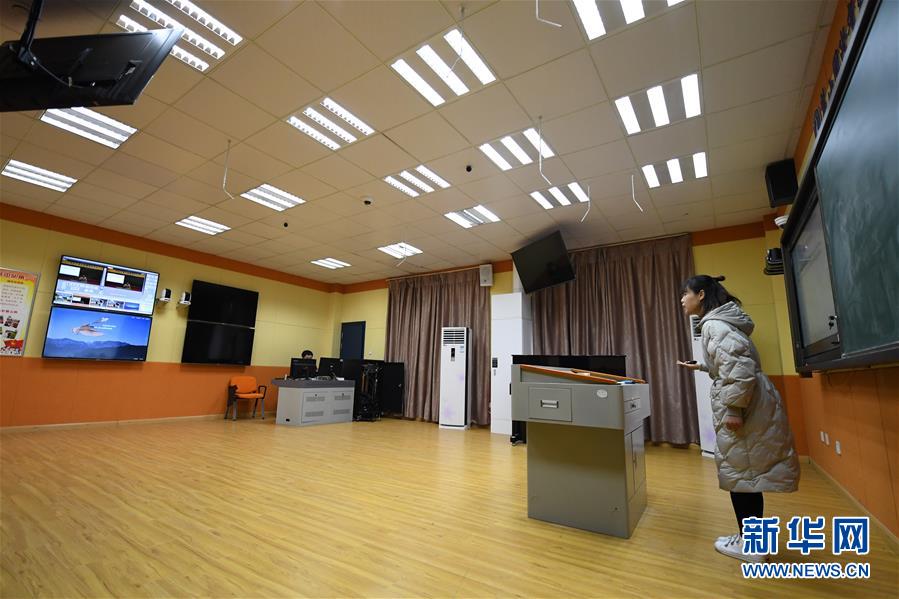 2月10日,长沙麓山国际实验小学英语老师黄宁在教室内通过后墙上的摄像头直播网络课程。新华社记者 薛宇舸 摄