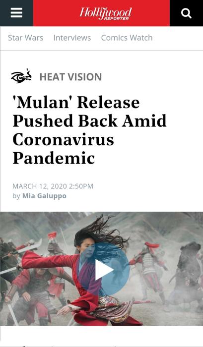 《花木兰》的导演妮基·卡罗在社交网站发文称:“我们很高兴能与全世界分享这部电影,但不幸的是,考虑到我们当下不断变化的环境,我们现在不得不推迟《花木兰》的全球上映。”
