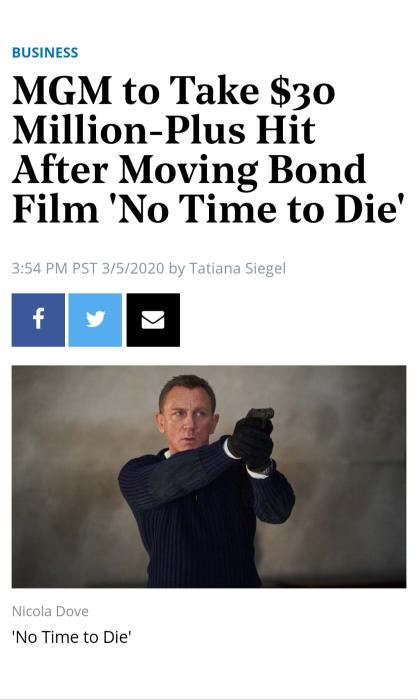 有外媒报道,《007:无暇赴死》推迟7个月上映,或使片方米高梅电影公司损失3000万到5000万美元。尽管这部电影的大部分营销活动还未推出,但还是花了一大笔钱,比如超级碗放预告片就花了450万美元。