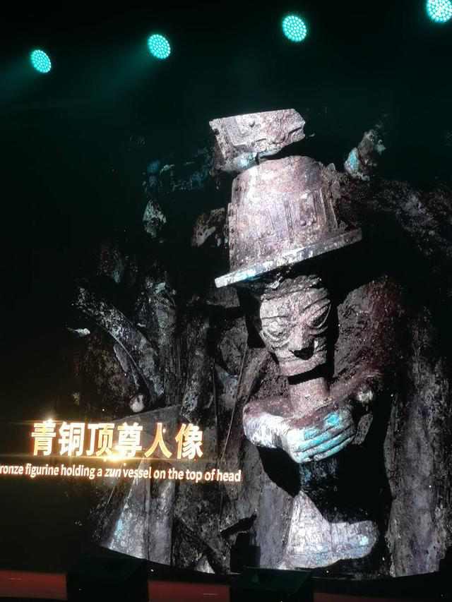 铜顶尊跪坐人像由上下两部分组成,上部为一件55厘米青铜大口尊,铜尊口沿内侧有短柱,肩部焊有精美的龙形装饰;下部则为一呈跪姿、双手持物于身前的高60厘米铜人。尊,古代用作酒器,在祭祀活动中体现敬重、推崇。铜顶尊跪坐人像再现了古蜀祭祀的隆重场景,也折射出古蜀文明祭祀的精神世界,是一件国宝级文物。